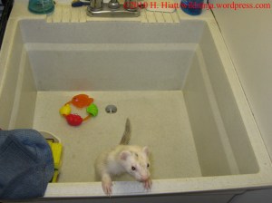 Lilly, a fluffy white ferret who would probably be a motivational speaker if she had a microphone, likes to do extreme sports in the sink. Once in awhile she pops up to survey her domain.