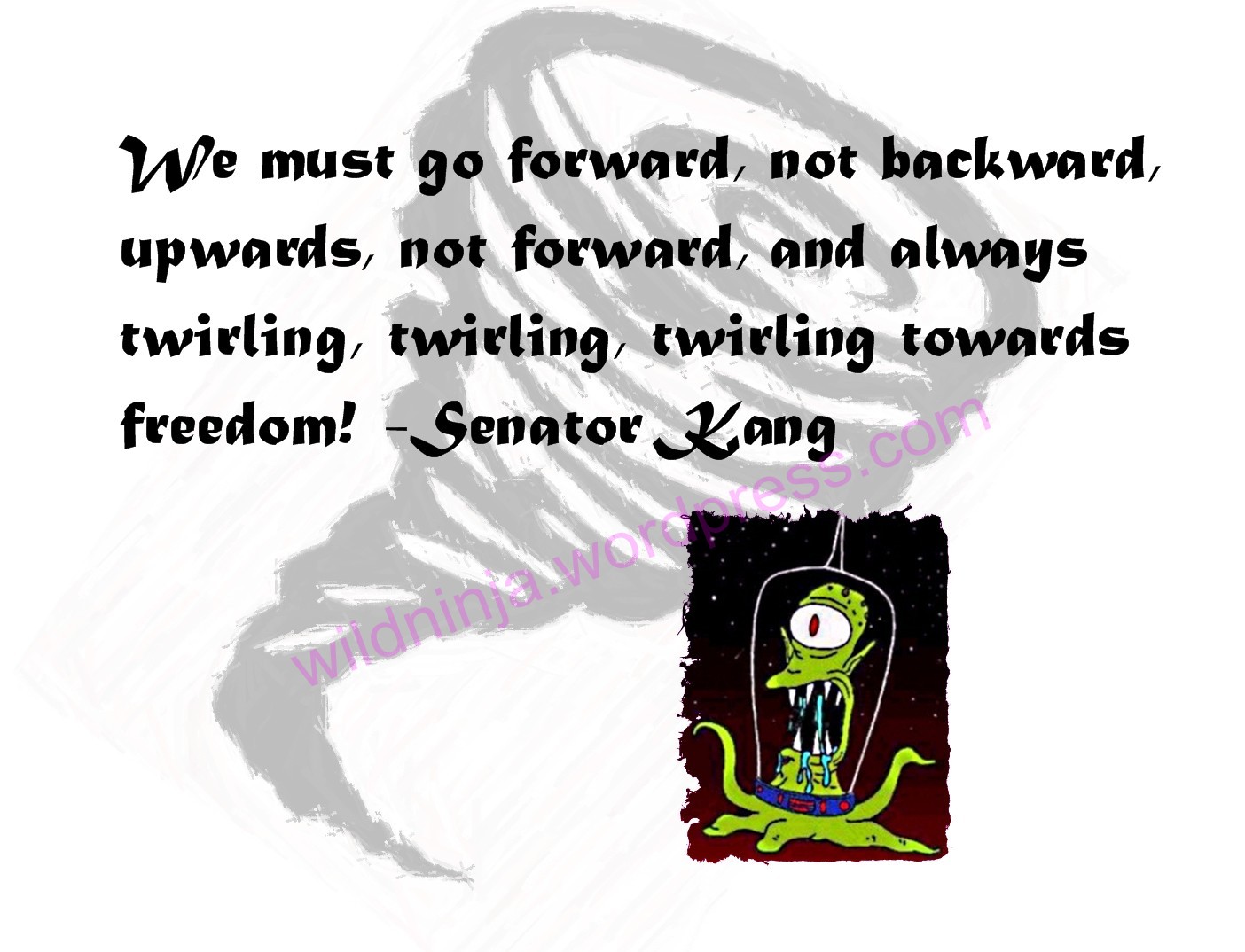 ***The graphic is a shirt I created for a relative’s birthday based on one of their favorite Simpsons quotes. Kang is a space alien who briefly took over Senator Bob Dole’s body in one Halloween episode. I’d much rather be twirling, twirling, twirling towards freedom tonight than seeing even one more attack ad. Feel free to join me.