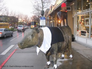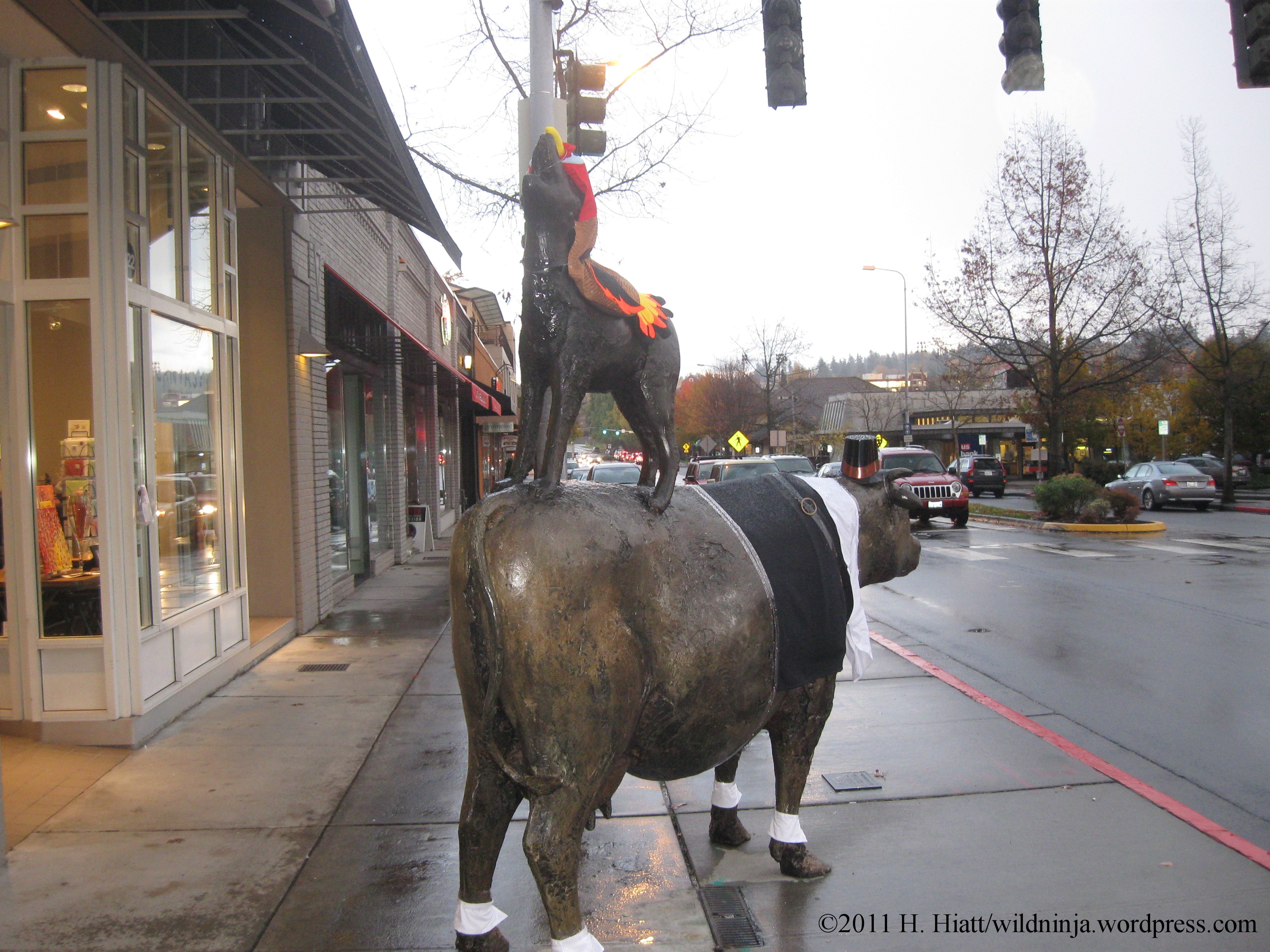Once again, the creative souls that decorate the cow and coyote sculpture in downtown Kirkland have been at work. This time we have a bovine pilgrim and a howlin’ turkey to gaze upon.