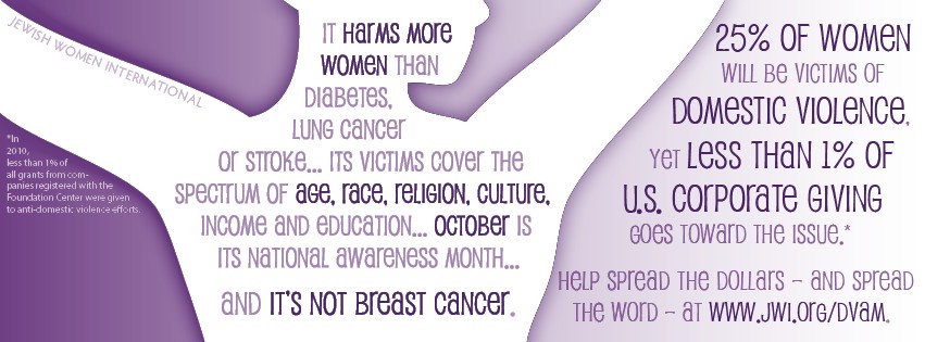 October is Breast Cancer Awareness Month, a time when pink ribbons and bracelets are everywhere because one in eight women will fight breast cancer in her lifetime. But October is also Domestic Violence Awareness Month, signified by the color purple, acknowledging that one in four women will be a victim of domestic violence. Given the narcissism and lack of respect for others that is prevalent in our society, I’ll bet the rates are higher than that.
