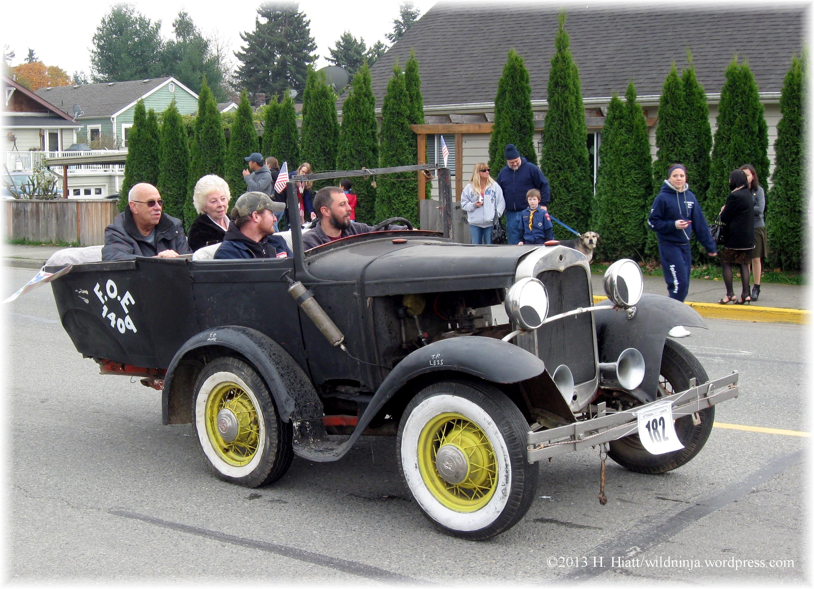 The F.O.E.– Fraternal Order of Eagles– was out in force to show their support for our troops. This jolly car was followed by a truck with a freakishly long trailer festooned in red, white, and blue that was overflowing with Eagles.