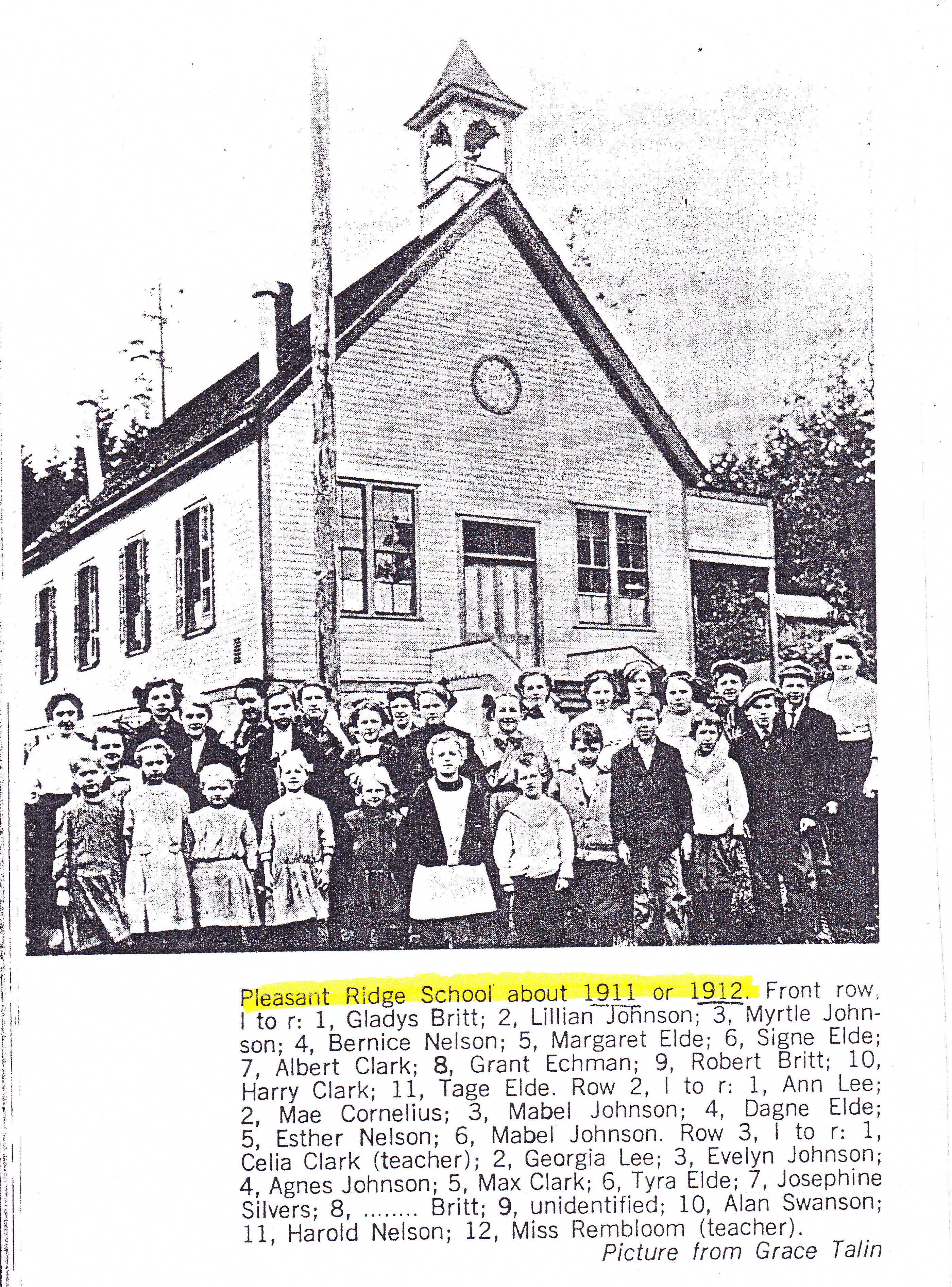 In 1883, Skagit County separated from Whatcom County and school districts were developed. The largest Pleasant Ridge school was built in 1891 and served the community for 38 years. The first teacher in the new structure was Mary E. Chilberg. The building still stands today.