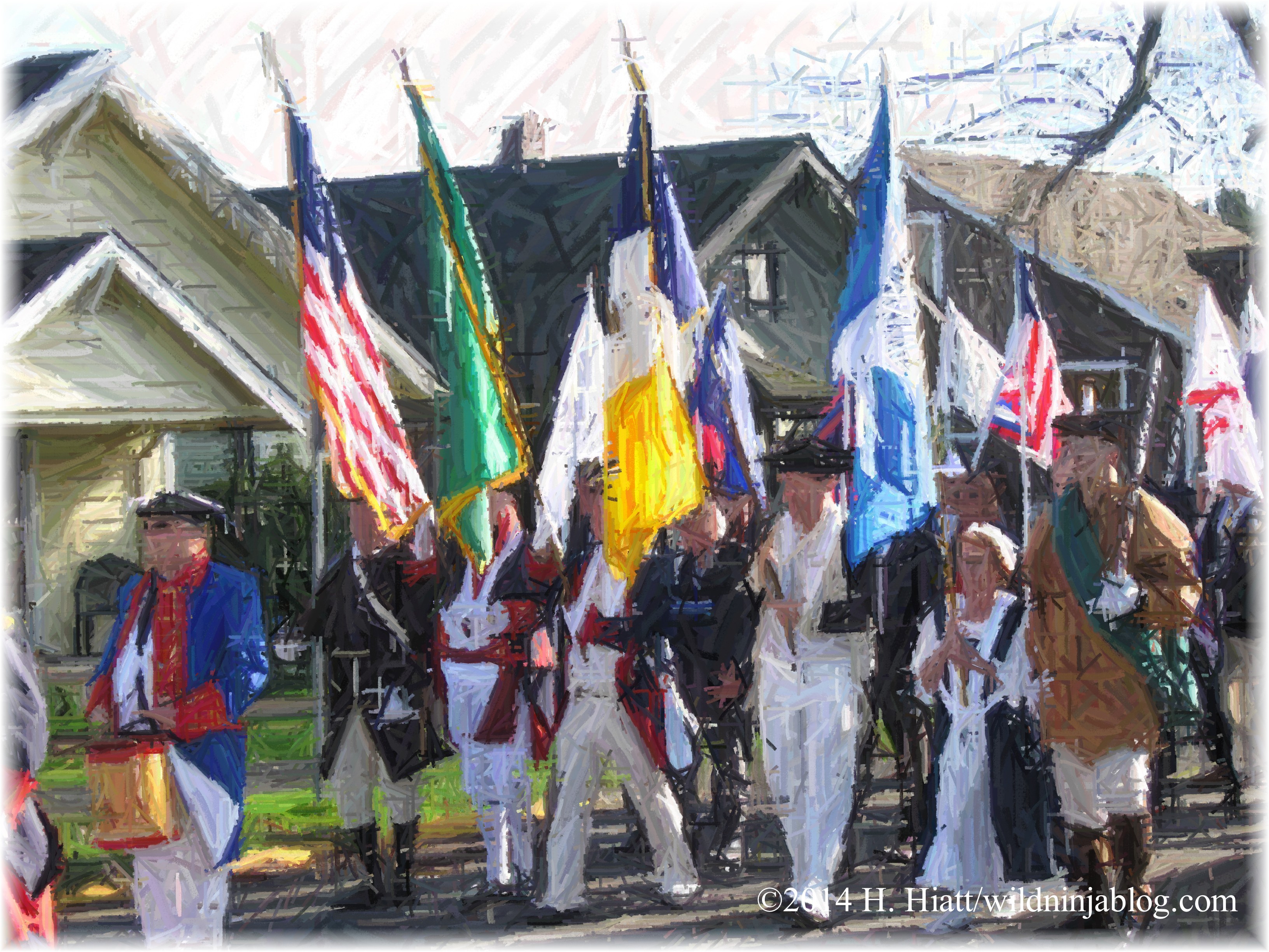 Here are the original American soldiers entering the procession, portrayed by the Sons and Daughters of the American Revolution. Members must prove that they are direct descendants of an American patriot. And many people are– have you checked? Sons of the American Revolution, Daughters of the American Revolution.