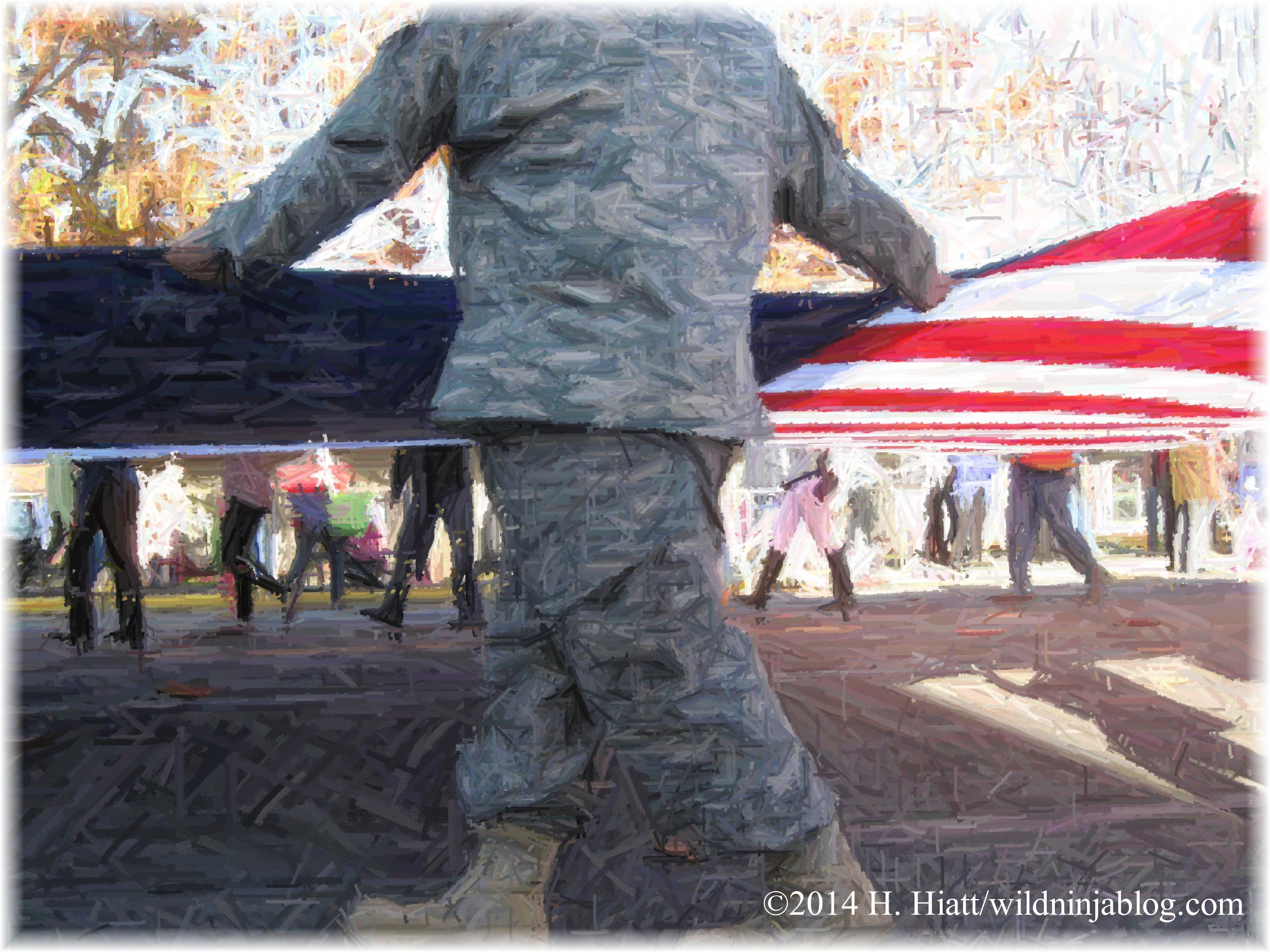 In conclusion, I return to the large American flag that was being carried down the street by both vets and civilians. Gerald Stanley Lee said, “America is a tune. It must be sung together.” What that flag represents, this nation, does need to be carried by all of us. The veterans can’t do it alone; we can’t do it without the veterans.