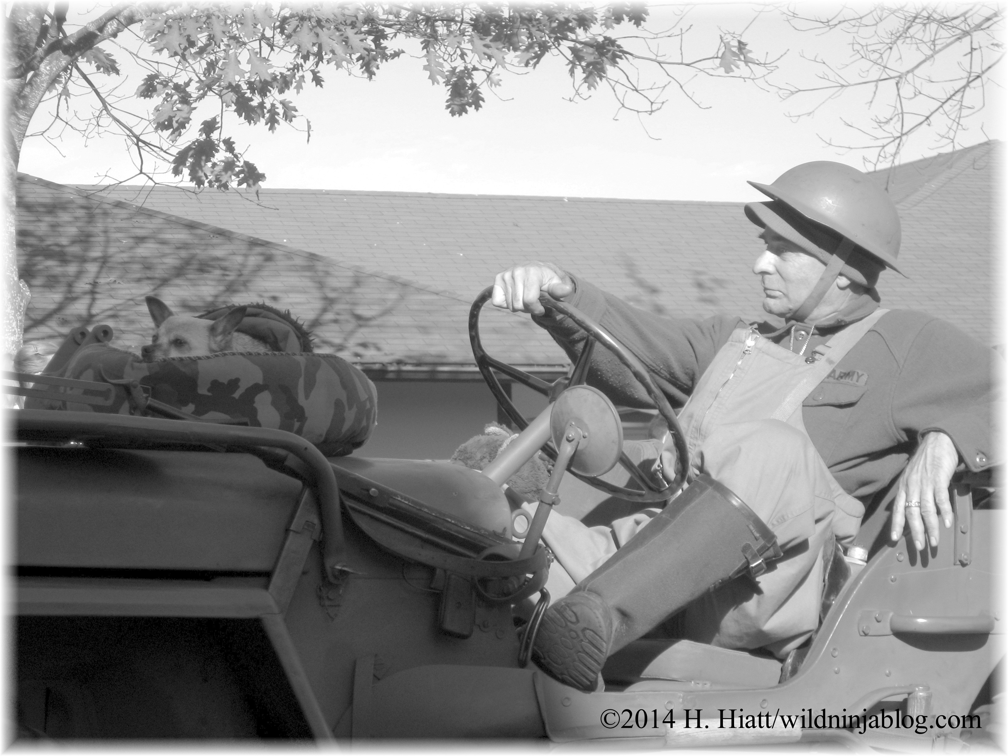 Here’s another patriotic puppy proud to participate in the parade. This one, sporting a cozy camouflage coat, was quite content to pass the time in a color-coordinated camouflage bed on the hood of this vintage Jeep.