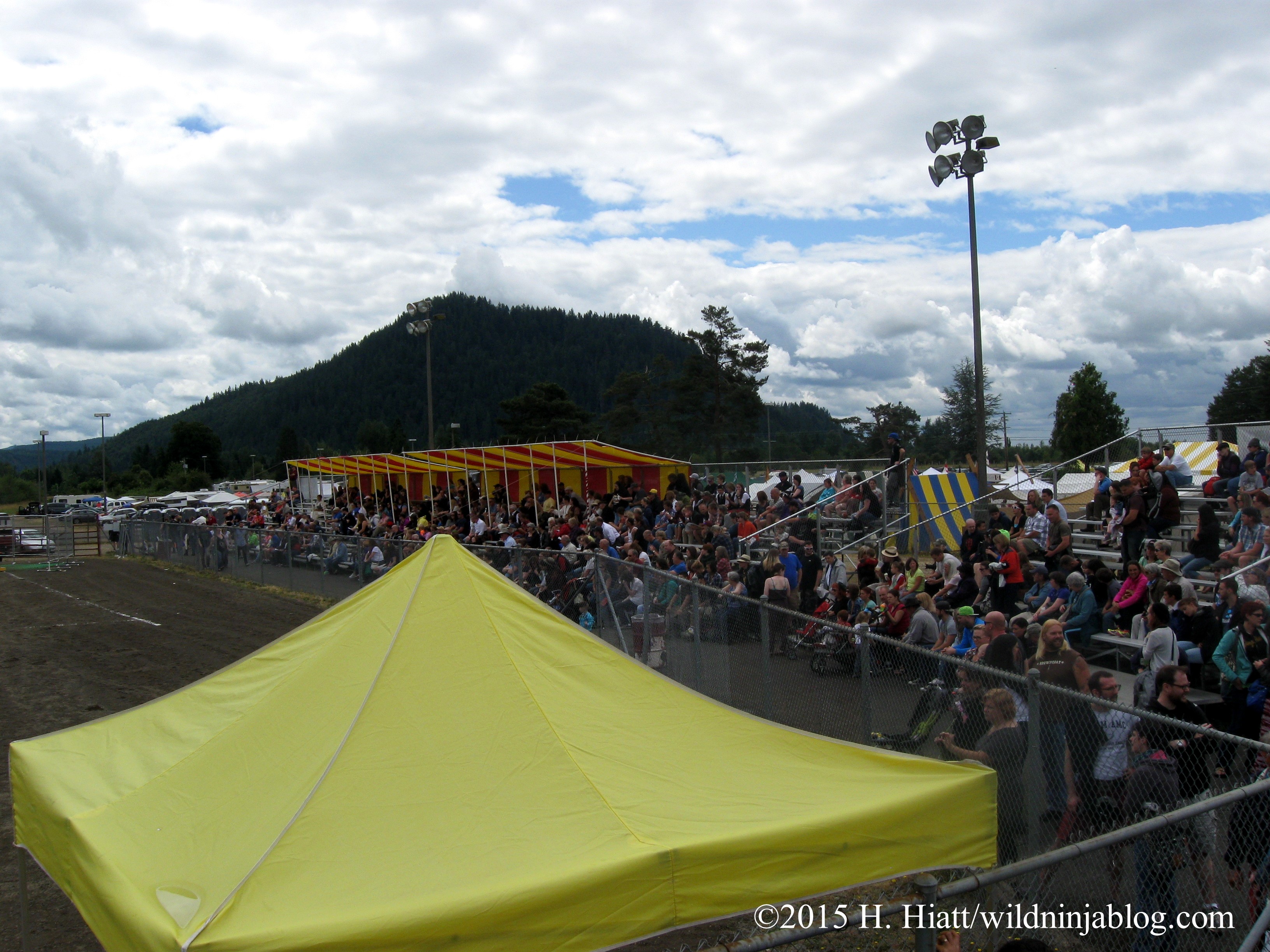 Looking over the grandstands to the south. The weather would be hot, then cold, then sprinkle, then burst out in sunshine. We were putting our jackets on and taking them off so often we must have looked like a flash mob doing some sort of routine.