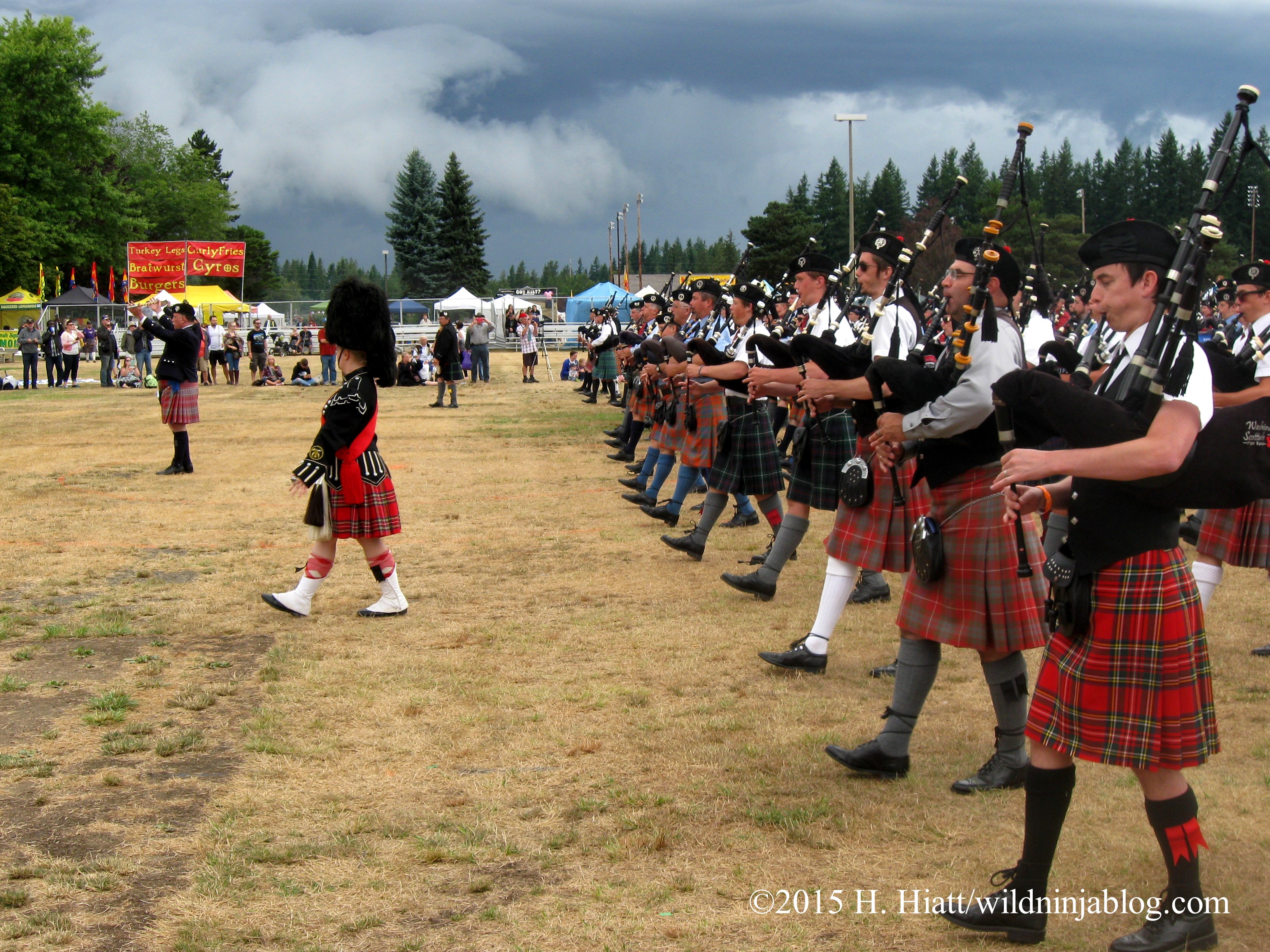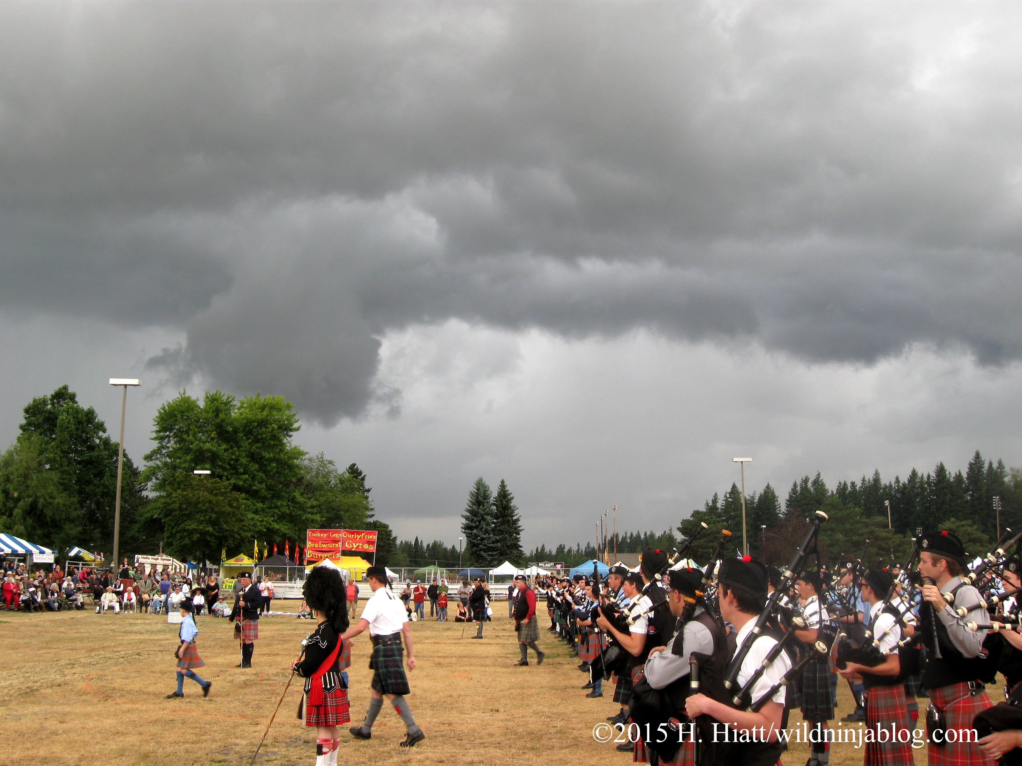 The musicians march forward as they play in unison. If you’ve never heard hundreds of bagpipers at once, you need to. Put it on your bucket list. It will rouse your Scottish blood something fierce. Note the looming clouds to the north.