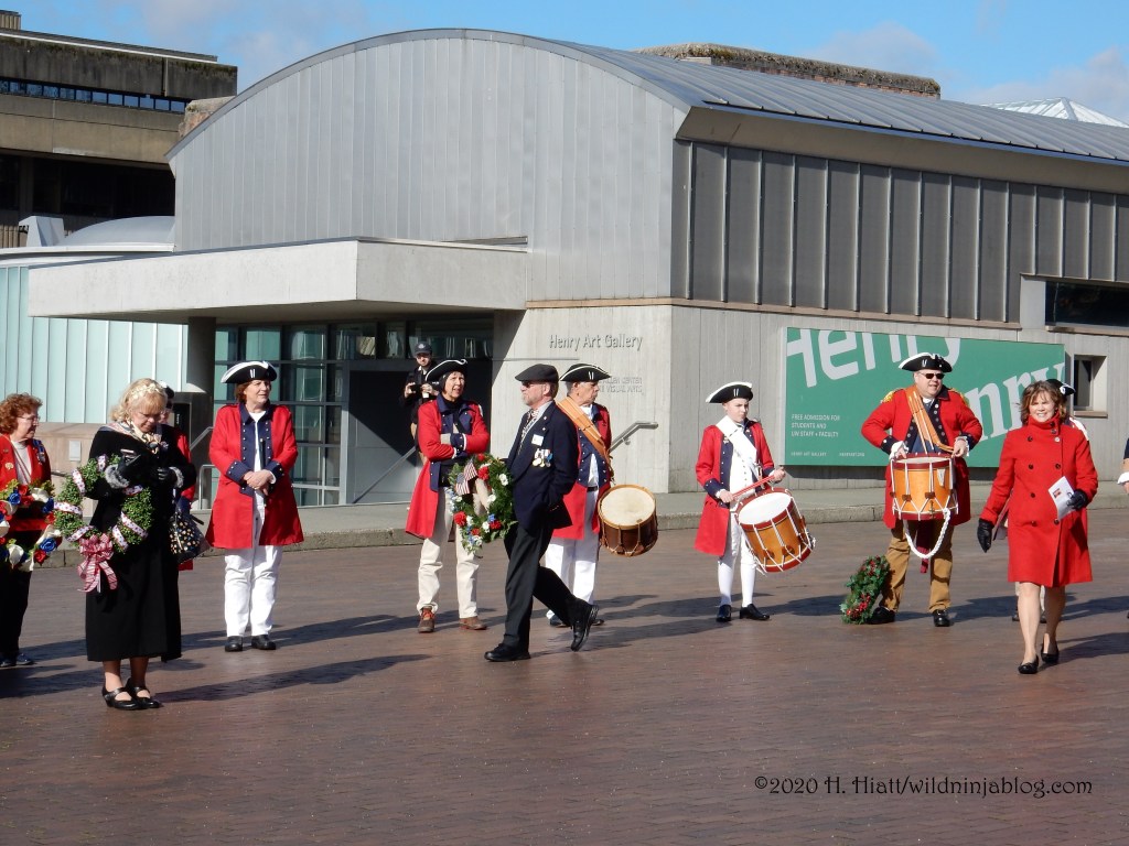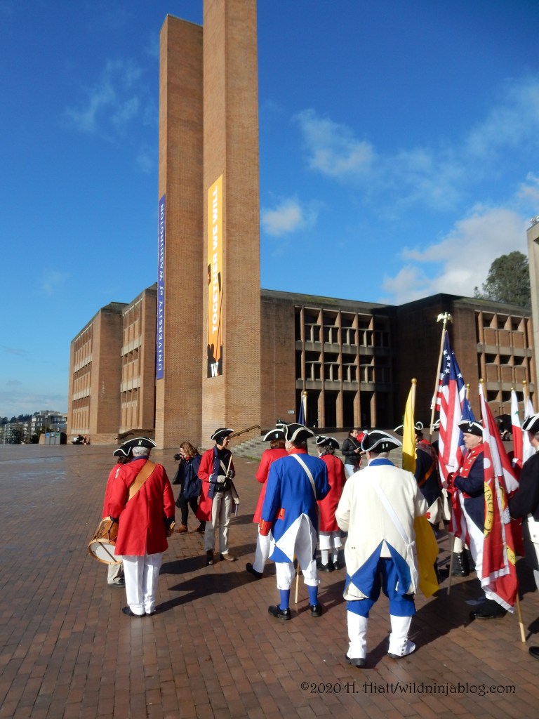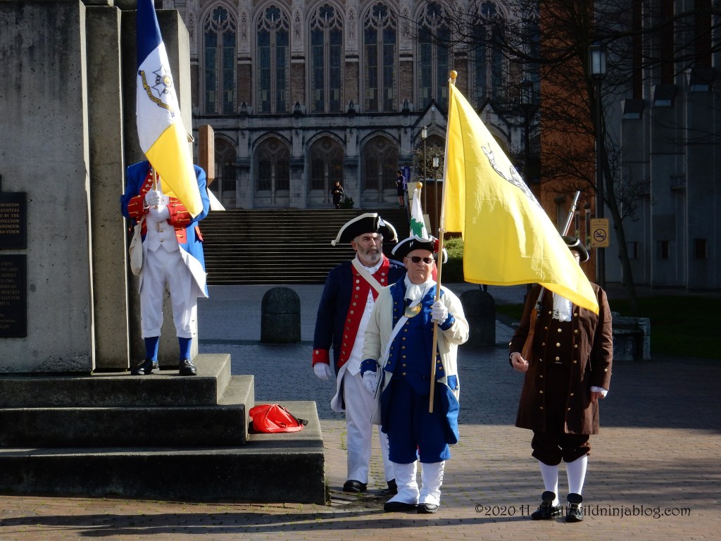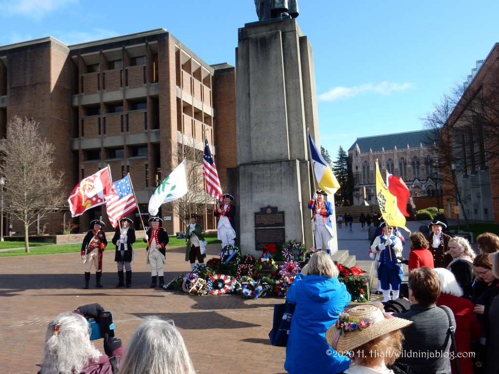 Presidents’ Day in Seattle this year was an unusually sunny Monday flecked with dramatic clouds. As they do every year, the Sons, Daughters, and Children of the American Revolution gathered on the University of Washington campus to pay tribute to its namesake along with compatriots from other historic organizations. For those who don’t know, membership in the SAR, DAR, and CAR are open to all who can prove lineal descent from a man or woman who served in or supported the American Revolution.