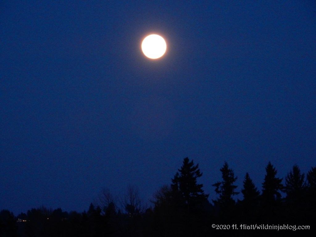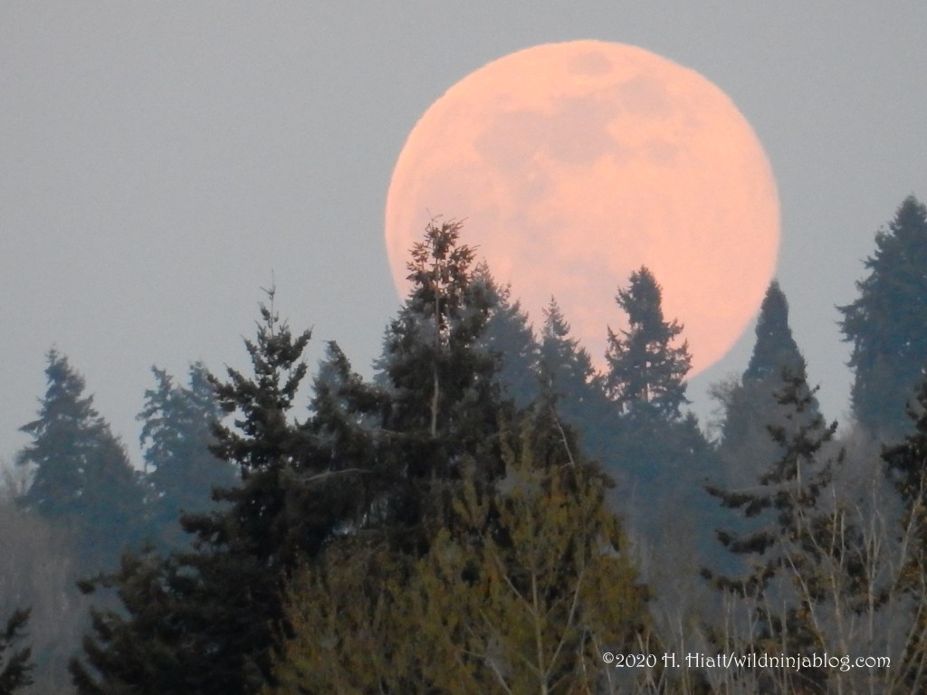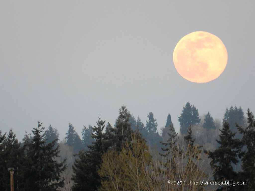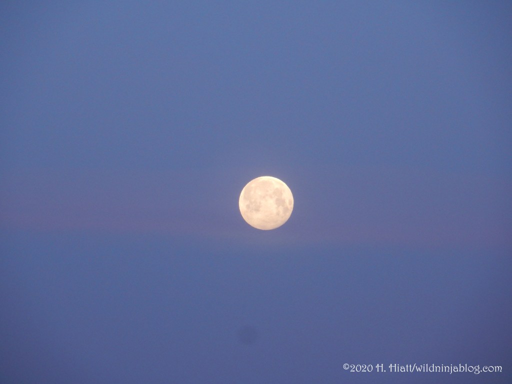 Driving to work the next morning, I was in awe of the still full moon dangling over the water in the pink and purple heavens. I’d stopped to get photos of the moon at dawn the day before– it appeared as a gargantuan orb splashed with molten xanthic. By the time I found a place to park it had disappeared behind a bank of clouds. So I was especially grateful to get these early morning shots.