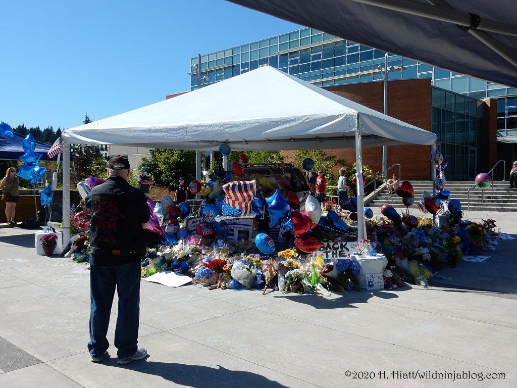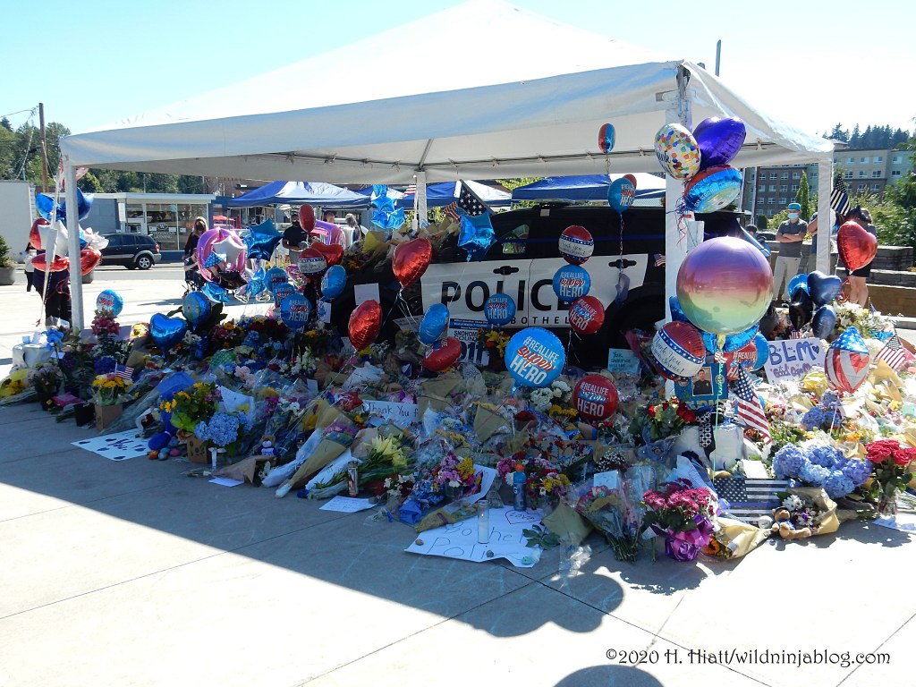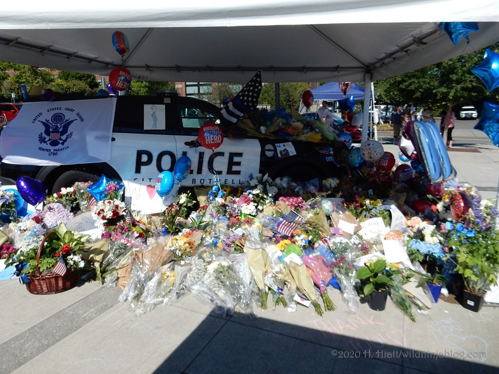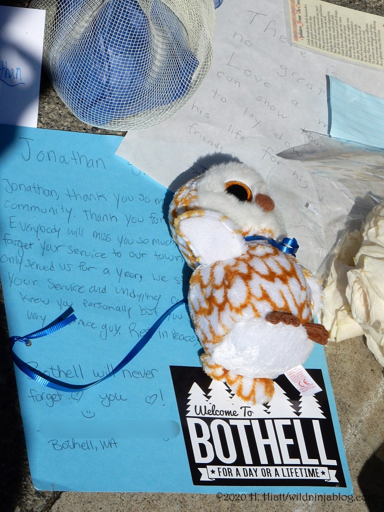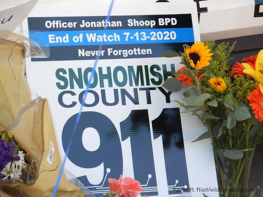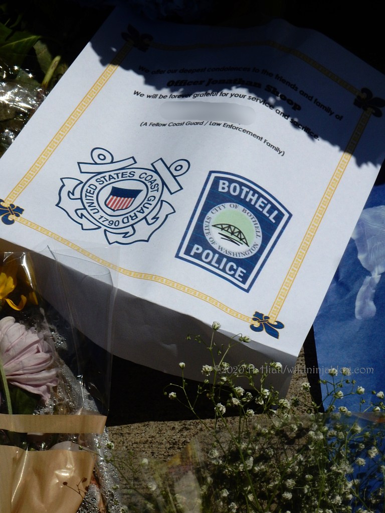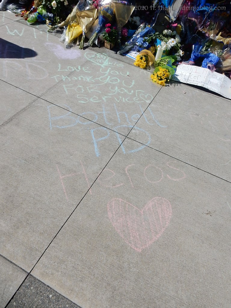 Last night a visit to the growing memorial to the Bothell police officer who was murdered resulted in the post You Matter. I visited the site again tonight and spent some quality time with both strangers and friends as we honored this brave man. The memorial continues to grow. People of all types continue to gather there to express appreciation to our area officers, including the officer who was wounded in this incident.